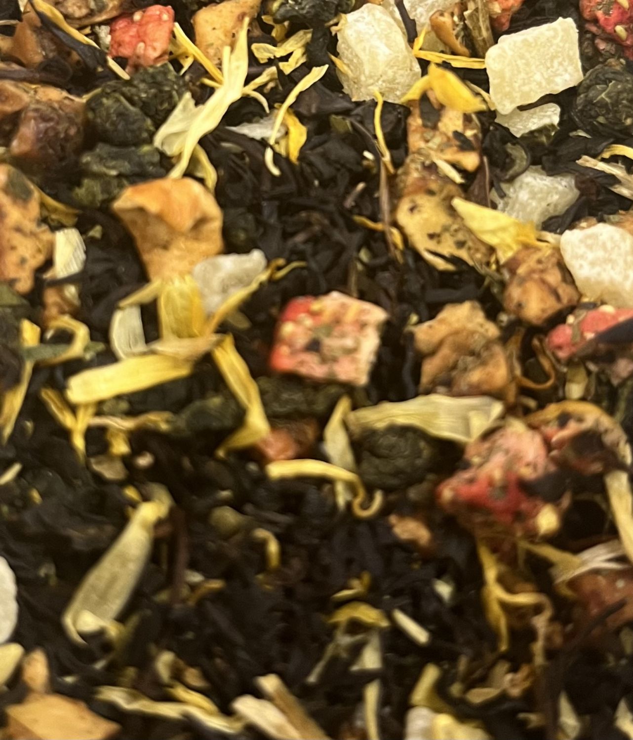 Te Negro Darjeeling Premium 55%, Te Oolong 10%, Manzana, Piña, Fresa, Lima, Mora dulce, Flores de Caléndula, trocitos de fresa liofilizada, aroma de vainilla.