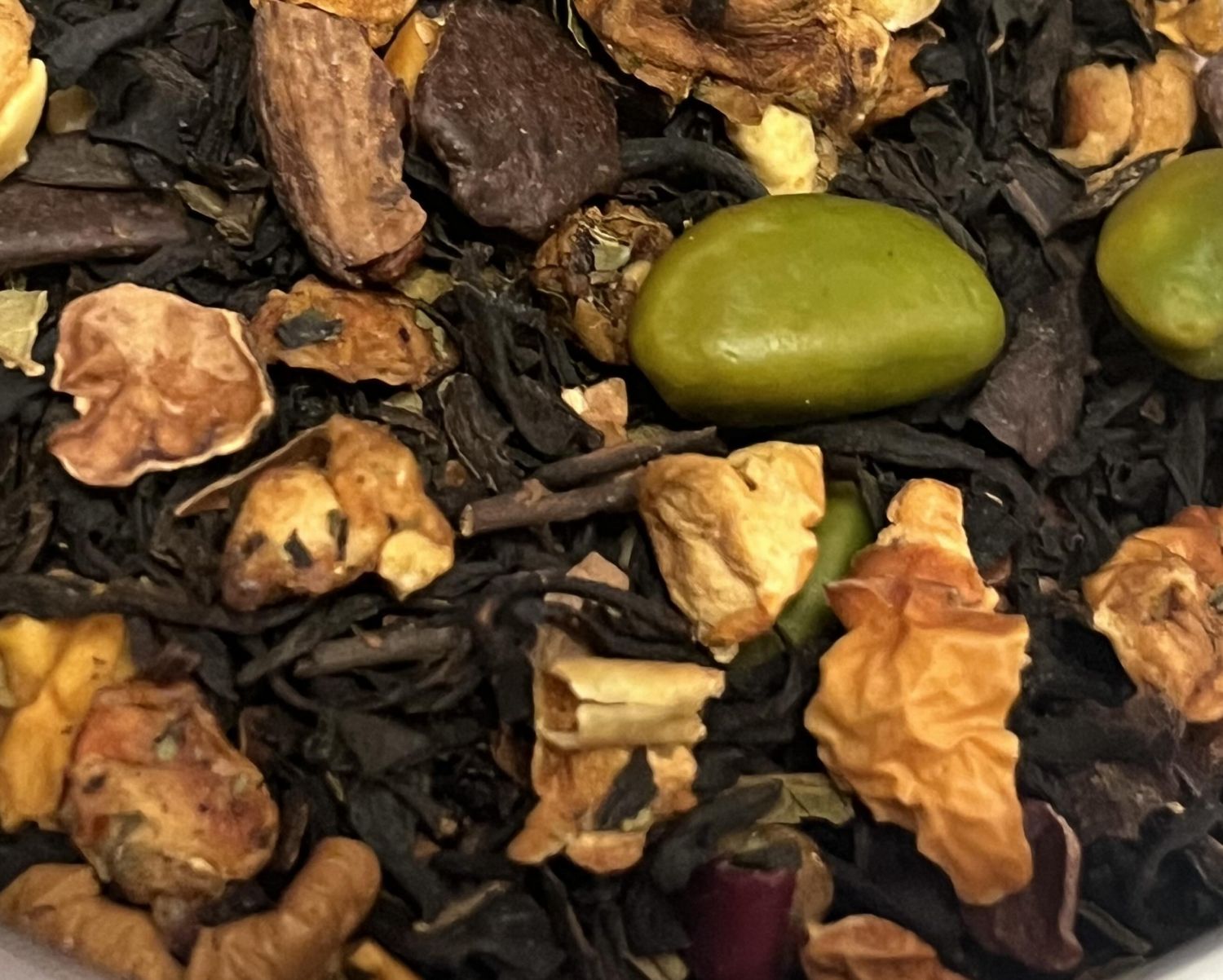 Además de los pedacitos de chocolate blanco y negro, los pistachos verdes brillantes se imponen en nuestra mezclas de tes premium,